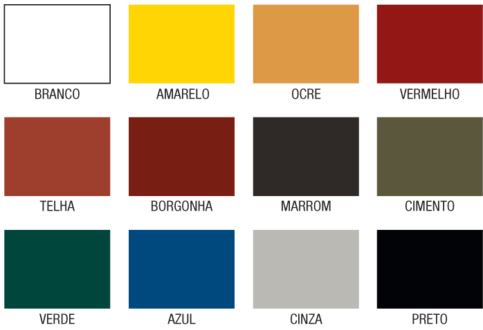 Cores: Branco Ótimo - Amarelo - Ocre - Vermelho - Telha - Borgonha - Marrom - Cimento - Verde - Azul - Cinza - Preto